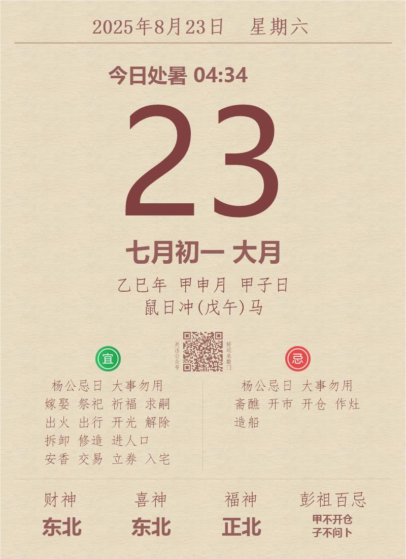 时宜:祈福 嫁娶 修造 入宅 安床 移徙 安葬 祭祀 求嗣 出行 求财 见贵 认养 开市