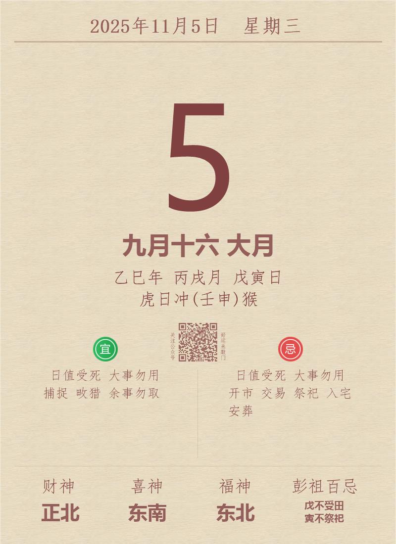 时宜:修造 盖屋 移徙 安床 入宅 开市 开仓 祭祀 祈福 酬神 出行 求财 见贵 纳采
