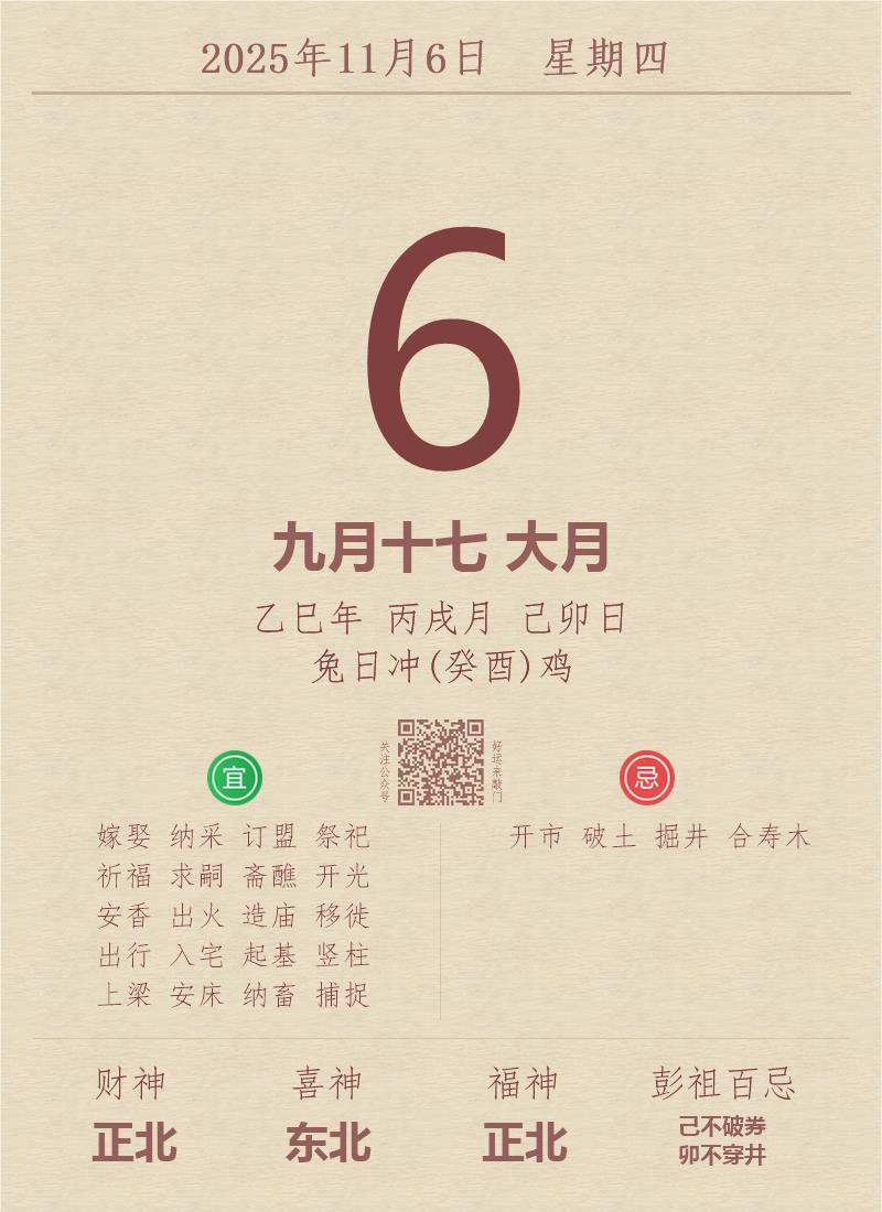 时宜:开市 入宅 修造 移徙 安床 作灶 安葬 祭祀 祈福 求嗣 嫁娶 出行 求财 交易